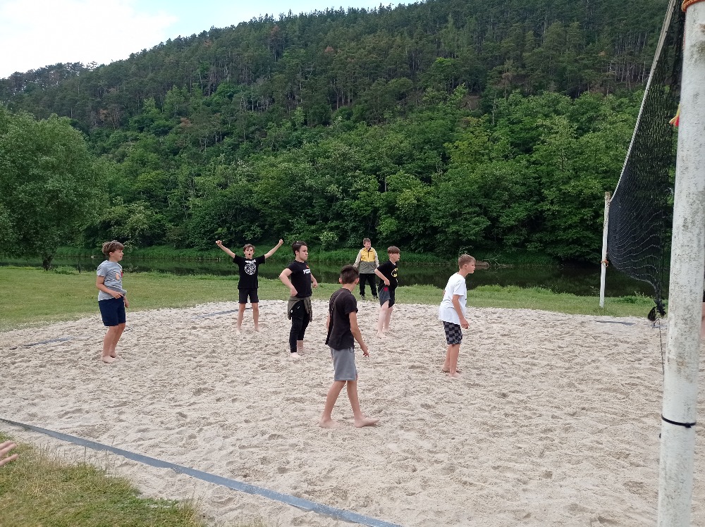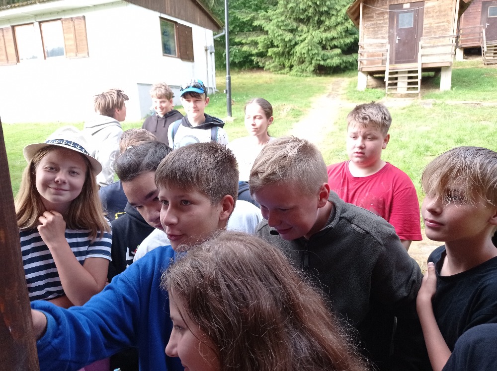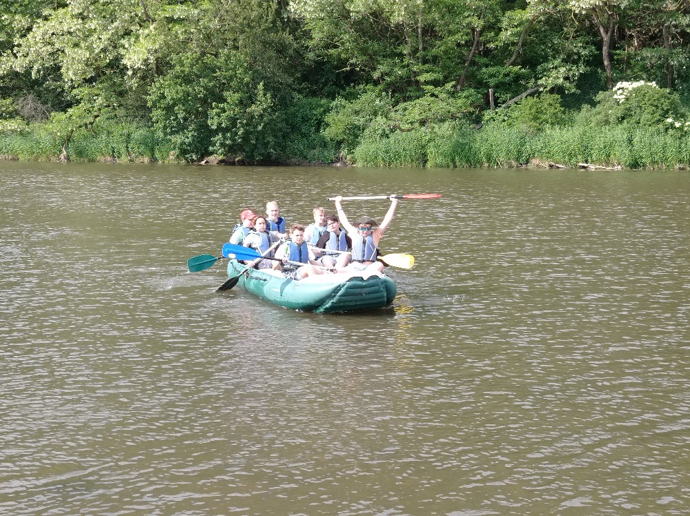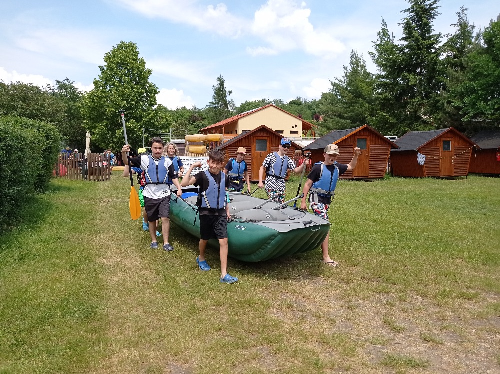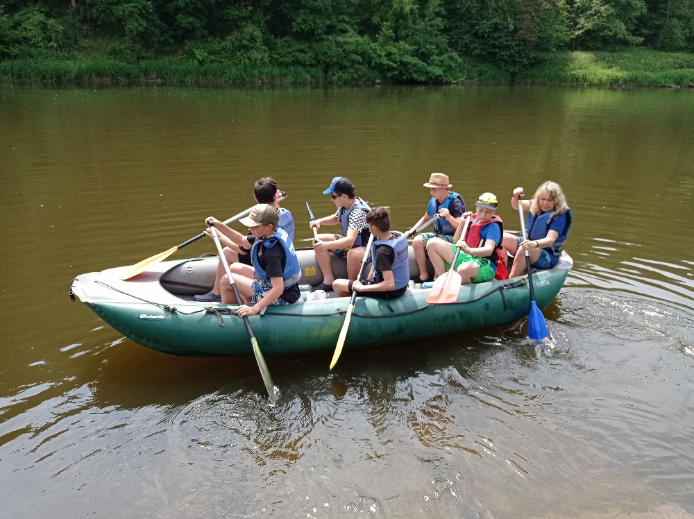 Na rozdíl od adaptačního kurzu v září bylo pěkné počasí. 12 km pěšky do Liblína a zpět na raftech.
