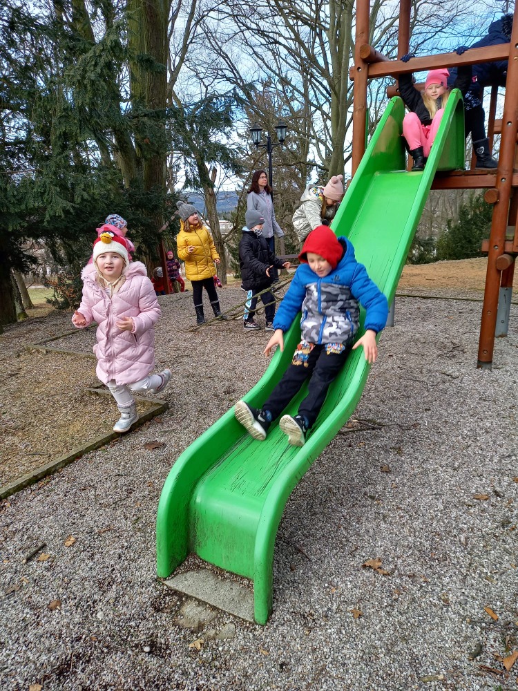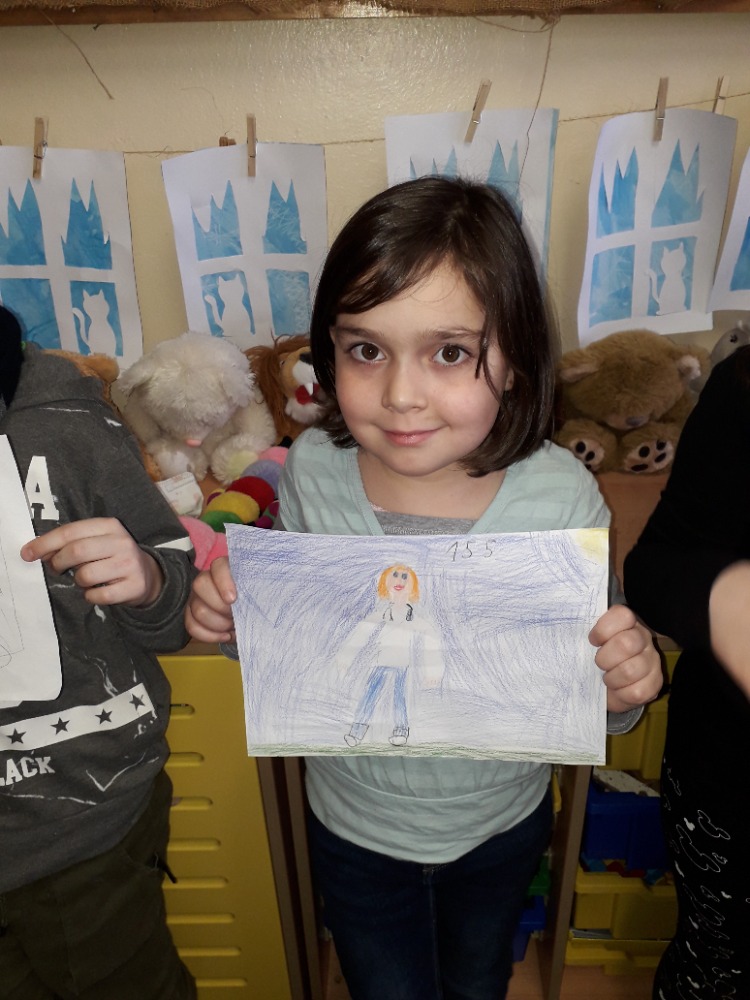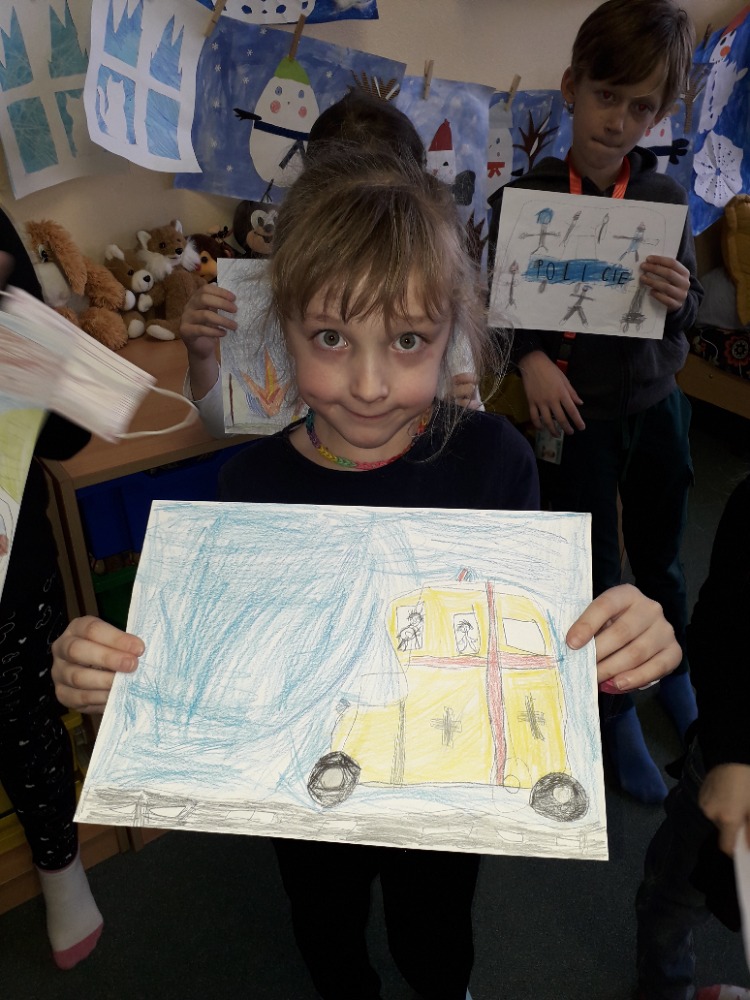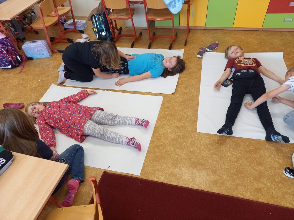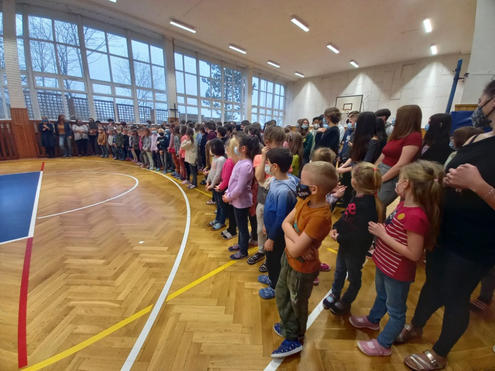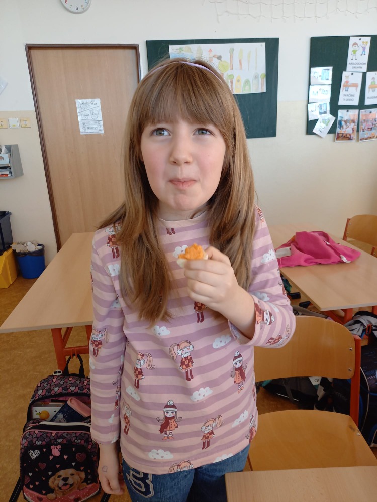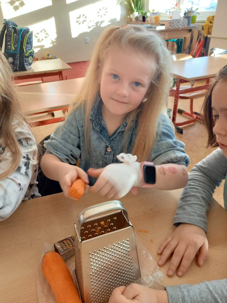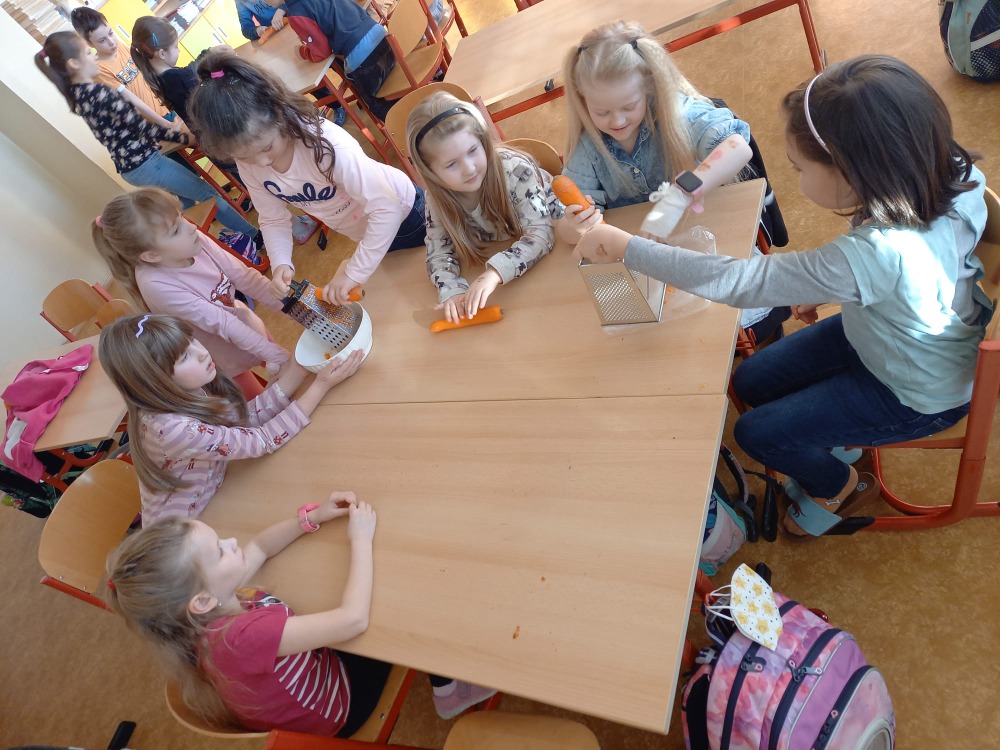 V únoru se žáci 1.B učili stolovat a vyrobili si mrkvovou pomazánku, která jim moc chutnala. Navštívili také zámeckou zahradu. Namalovali obrázky jako poděkování pro záchranné sbory, předání všech darů se uskutečnilo v tělocvičně.