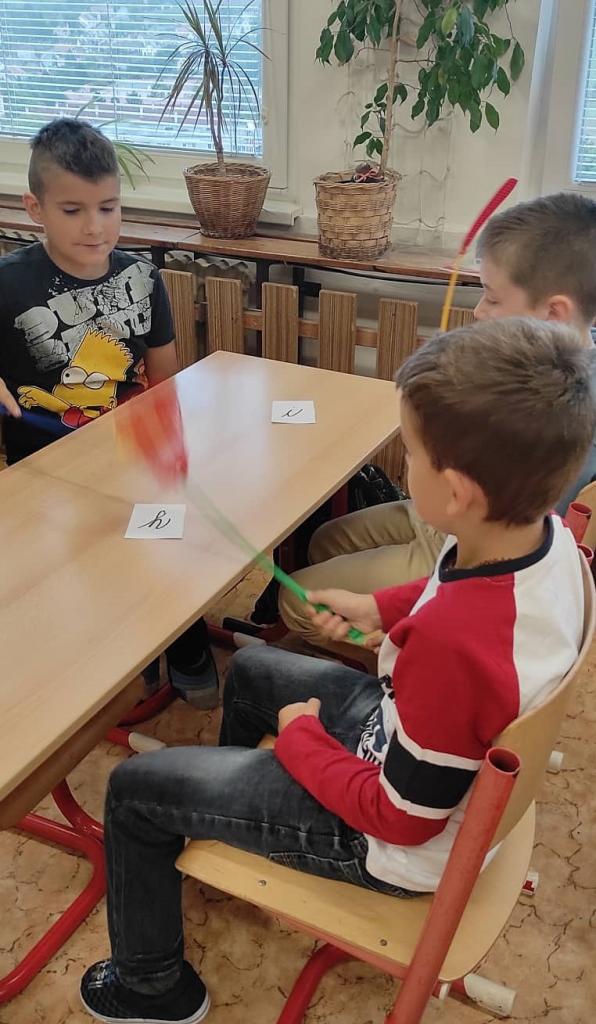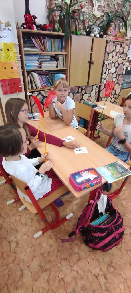 Při výuce využíváme také plácačky. S jejich pomocí si procvičujeme měkké a tvrdé slabiky, vyjmenovaná slova i rody podstatných jmen.